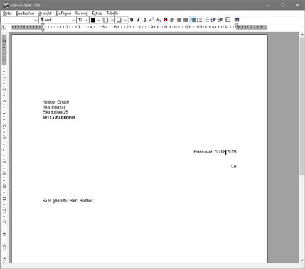 Mit dem internen Texteditor lassen sich ebenfalls Dokumente erstellen. Die Dokumente werden im RTF- Format gespeichert und lassen sich über das Menü oder die Toolleiste formatieren. Es handelt sich hierbei um ein relativ einfaches Textverarbeitungsprogramm, dass allerdings alle notwendigen Funktionen für den normalen Bedarf im Büroalltag mitbringt. Durch das überschaubare Angebot an Funktionen lässt es sich einfach erlernen und ist extrem schnell beim Aufruf und bei der Verarbeitung. Da die Texte direkt im RTF- Format gespeichert werden, sind diese kompatibel zu praktisch allen am Markt erhältlichen Textverarbeitungsprogrammen. Die Funktionsweise ist dem allgemein üblichen Schema angepasst.
