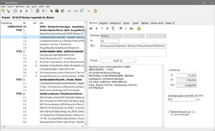 Nach Aufruf der Ausschreibung erscheint zunächst die Projektauswahl. Klicken Sie auf das gewünschte Projekt und es erscheint die Ausschreibungsmaske. Im linken Fenster findet sich die Auswahlliste. Durch einen Mausklick auf eine Position werden deren Daten in den Registern auf der rechten Seite angezeigt. Die einzelnen Register zeigen unterschiedliche Positionsdaten und werden im Laufe dieses Kapitels behandelt.