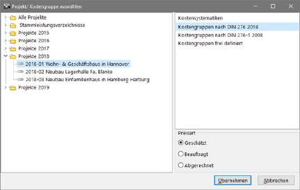 Mit Hilfe der Schalter Projekt 1 und Projekt 2 wählen Sie die zu vergleichenden Projekte aus. Beim Anklicken einer dieser Schaltflächen erscheint nachfolgendes Fenster am Bildschirm. Wählen Sie zuerst aus der linken Liste das gewünschte Vergleichsprojekt 1 oder 2. Wählen Sie anschließend mit dem Mauszeiger die gewünschte Kostensystematik im rechten Fenster und zum Abschluss die unten aufgeführten Preisarten/Kostenstände. Mit Bestätigung durch die Schaltfläche Übernehmen wird der Vergleich anschließend im Hauptfenster angezeigt.