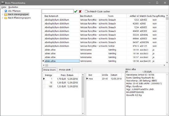 In der links dargestellten Baumansicht kann die Ansicht der Artikel nach Pflanzengruppen oder Warengruppen eingeschränkt werden.