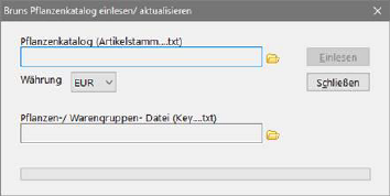 Für den Pflanzenkatalog geben Sie die Datei Artikelstamm_20xx.txt an. Für die Schlüsseldatei geben Sie die Datei Key_20xx.txt an. Die aktuelle Währung ist EURO.