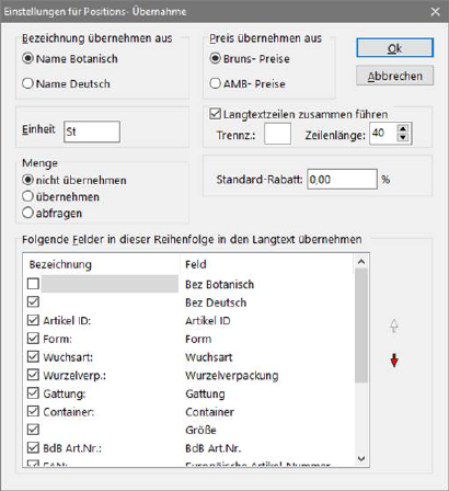 Im Dialog Einstellungen für Positionsübernahme, erreichbar über den Menüpunkt Datei/ Einstellungen, können verschiedene Einstellungen für die Übernahme von Positionen in die Ausschreibung vorgenommen werden. Für die Langtextübernahme lässt sich neben der Reihenfolge auch die Bezeichnung der Felder verändern. Im Register Text werden die Änderungen nach Bestätigung des Dialogs mit OK sofort angezeigt. Die Auswahl des Preises (Bruns oder ABM) geschieht über die Position des Datensatzzeigers in der Preistabelle.