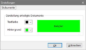 In der Dokumentenverwaltung finden Sie unter dem Windowsmenü Datei den Untermenüeintrag Einstellungen. In dem erscheinenden Fenster können Sie festlegen, wie erledigte Dokumente farblich darzustellen sind. Durch die unterschiedliche Farbgebung sind unerledigte Dokumente schneller und bequemer visuell zu erfassen. Die Einstellung wirkt sich auch auf die übrigen Module aus, in denen Dokumente angezeigt werden (allerdings erst nach Neustart der Module).