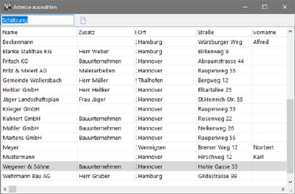 Das Adressauswahlfenster wird von vielen ASBwin - Modulen für eine schnelle Suche in der Adresstabelle verwendet. Geben Sie im linken oberen Eingabefeld des Adressauswahlfensters den gesuchten Namen ein. Während der Eingabe des gesuchten Namens läuft das Programm durch den Adressdatenbestand und zeigt die jeweils in Frage kommende Adresse an.