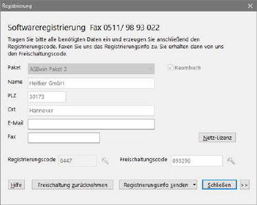Klicken Sie die Taste Registrierungsinfo senden und mailen Sie uns das Formular zu. Alternativ können Sie auch die Option Registrierung drucken auswählen und uns den Bogen zufaxen. Wir lassen Ihnen daraufhin den Freischaltungscode zukommen. Tragen Sie diesen in das entsprechende Feld ein und schalten Sie das Programm mit der gelben Schlüsseltaste hinter dem Feld Freischaltungscode frei.