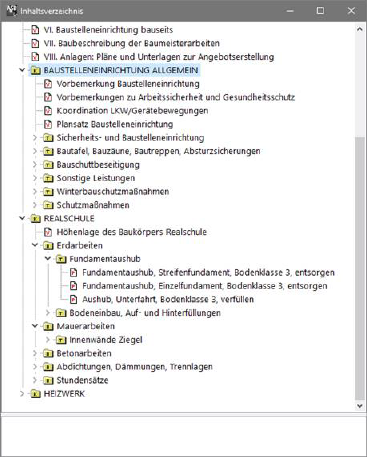 Hier wird das Projekt mit seinen Verzeichnissen und Positionen als Baum dargestellt. Durch Anklicken mit der Maus können Sie die einzelnen Äste öffnen und schließen. Im Drag & Drop - Verfahren lassen sich hier einzelne Positionen mit der Maus z. B. in andere Titel ziehen. Bei Bedarf können auch ganze Titel verschoben werden. Um an eine bestimmte Position zu gelangen, klicken Sie auf diese Position und anschließend wieder in das normale Ausschreibungsfenster. Das Inhaltsverzeichnis wird ausgeblendet und Sie befinden sich wieder im normalen Arbeitsmodus mit der gewünschten Position am Bildschirm. Das Inhaltsverzeichnis lässt sich auch über das Kontextmenü in der Auswahlliste aufrufen. Klicken Sie hierzu mit der Maus in die Auswahlliste und betätigen Sie anschließend die rechte Maustaste.
