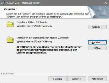 Die Installation im Netz kann von einem beliebigen Arbeitsplatz aus erfolgen, der über Administratorenrechte für den Server verfügt. Geben Sie als Zielordner ein Verzeichnis auf dem Server an. Wir empfehlen, die Einträge in UNC - Notation (\\<ServerName>\<Freigabename>\<Pfad>) vorzunehmen.