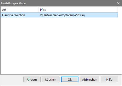 Nach Aufruf von ASBwin starten Sie im Hauptmodul mit der Tastenkombination Strg + Alt + P nachfolgenden Dialog. Für eine Standardinstallation im Netz muss nur der Hauptverzeichnispfad definiert werden. Setzen Sie diesen auf das zuvor angelegte ASBwin - Verzeichnis. Der Eintrag muss nur am aktuellen Arbeitsplatz vorgenommen werden und gilt für alle weiteren Arbeitsplätze.