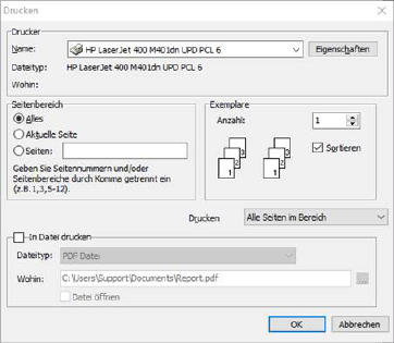 Für die meisten Listen lässt sich die Druckausgabe bei Bedarf in eine Datei umleiten. Der Dateityp lässt sich in der angezeigten Combobox festlegen.