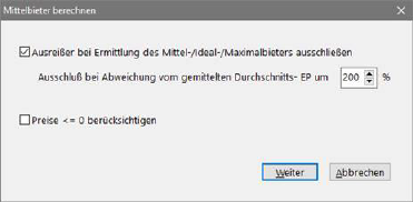 Diese sogenannten Ausreißer würden ansonsten den Mittel- oder Idealwert zu sehr verfälschen. Falls Ihnen die oben beschriebenen Einstellungen zu umfangreich erscheinen, können Sie diese auch ignorieren. Die Standardeinstellungen des Programms gehen immer vom Regelfall aus. Es werden alle Bieter zur Berechnung des Mittels herangezogen.