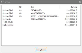 In der Angebotsprüfung werden die Summen der Gliederungsstufen dargestellt. Die Zeilen MwSt. und Brutto werden ebenfalls erfasst. Bei Eingabe einer angebotenen Summe wird ein Warnton erzeugt, wenn diese Summe vom errechneten Wert abweicht.