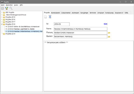 Aus dem Hauptprogramm von ASBwin starten Sie das Modul Projekt. Hier sehen Sie auf der linken Seite die bereits vorhandenen Projekte. Nach einer Neuinstallation werden die Beispielprojekte angezeigt.