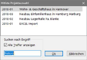Wollen Sie bei einer großen Anzahl von Projekten nach einem bestimmten Projekt suchen, betätigen Sie die Funktionstaste F3. Es wird daraufhin ein Fenster mit einer Suchfunktion geöffnet. ASBwin merkt sich die zuletzt verwendeten Projekte in einer Hitliste. Diese Funktion ist in allen Modulen aktiv, in denen eine Projektauswahl vorgeschaltet ist. Sie können die Funktion mit F3 aufrufen, wenn Sie sich im Projektauswahlfenster befinden. Hier werden ebenfalls Wildcards unterstützt (*,?). Die infrage kommenden Projekte können in einer Liste angezeigt werden.