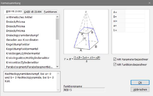 Mit den Schaltern fx und fx-de der Registerseite Menge starten Sie den integrierten Formelgenerator unter ASBwin. Mit fx wird ein Fenster zur grafischen Ermittlung geöffnet. Wählen Sie über die links angezeigten Register aus drei Formelsammlungen. Mit Hilfe dieser Formelsammlungen lassen sich auch komplexe Mengenermittlungen unter ASBwin durchführen. Wählen Sie links die Formel aus und tragen Sie anschließend auf der rechten Seite die Parameterwerte ein. Bei fortlaufender, nicht begrenzter Anzahl von Parametern bewegen Sie die Pfeiltaste entsprechend ein Feld nach unten. Bei Bestätigung mit OK wird die Formel samt ermitteltem Ergebnis in Ihre Mengenberechnung übernommen.