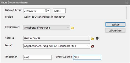 Dokumente werden automatisch unter dem zugehörigen Projekt und der Adresse abgelegt. Um neue Dokumente zu erfassen, betätigen Sie den entsprechenden Schalter in der Schalterleiste. Es erscheint das Dokumentenerfassungsfenster. Das Programm schlägt Erfassungsdatum und Uhrzeit vor. Wählen Sie anschließend die Dokumentenart aus.