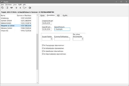 Zur Ermittlung der fiktiven Bieter wie Mittel-, Ideal- und Maximalbieter können hier auch einzelne Angebote ausgeschlossen werden. Somit ist es auch möglich, verschiedene Mittelbieter zu bilden, bei denen nur die ersten drei Angebote oder alle Angebote berücksichtigt werden.