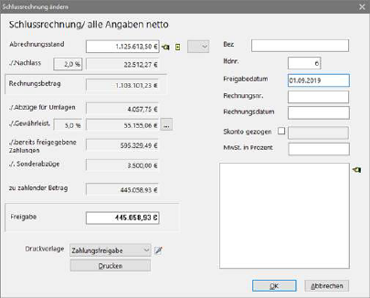 Nach Subtraktion aller Abzüge und Einbehalte ermittelt das Programm wieder die Zahlungsfreigabe und trägt diesen Betrag im Feld Freigabe ein.