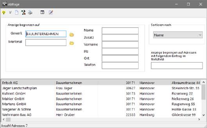 Eine weitaus mächtigere Suchfunktion stellt die sogenannte Abfrage dar. Betätigen Sie hierzu den Abfrageschalter in der oberen Schalterleiste. Es erscheint die Abfragemaske am Schirm. Hier können Sie nun verschiedene Suchkriterien eingeben und diese miteinander verbinden. Geben Sie z. B. als gesuchtes Gewerk Bauunternehmen ein. Sie können hierzu den Auswahlschalter hinter dem Eingabefeld benutzen. Geben Sie zusätzlich den Ort Hannover ein. Bei Starten der Abfrage mit dem Aktivierungsschalter (Glühlampe oben links) werden alle in Frage kommenden Adressen angezeigt.