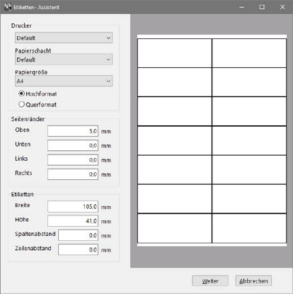Diese Liste erzeugt Etikettenlisten. Sie können unterschiedliche Etikettenformate bearbeiten. Hierzu wird ein Report- bzw. Listendesigner angeboten. Richten Sie sich die gewünschten Etikettenlisten mit den Adressdatenfeldern ein und wählen Sie später eine der Listen für den Ausdruck aus.
