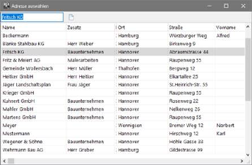 Im nächsten Feld wird das aktuelle Datum erfasst. Um einen Auftragnehmer zuzuweisen, öffnen Sie mit dem Schalter hinter dem Firmenfeld die Adressenliste. Mit dem Rollbalken oder einem Eintrag in das Suchfeld können Sie in der Liste navigieren. Durch Doppelklick auf eine Adresse wird diese als Auftragnehmer übernommen.