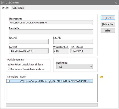 Dialog zum Einlesen von DA 11/12 - Dateien