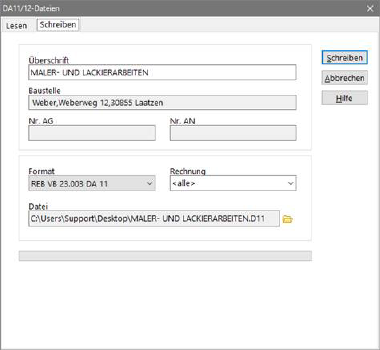 Dialog zum Schreiben von DA 11/12 - Dateien