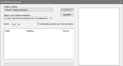 Im Importfenster wird als Vorgabe die Einstellung Neuen Katalog anlegen angezeigt. Bei Aktualisierung (z. B. von Preisen) vorhandener Kataloge wählen Sie bitte den gewünschten Katalog aus. Wählen Sie anschließend den Pfad zu Ihren DATANORM- Daten durch Anklicken des gelben Ordners. Die gefundenen Dateien werden in der unteren Liste angezeigt und lassen sich mit dem Schalter Einlesen importieren.