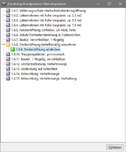 Sie können Alternativpositionen per Drag & Drop einer Grundposition zuweisen. Öffnen Sie das Fenster mit dem Schalter Zuordnung Alternativpositionen auf der ersten Registerseite. In dem Fenster können Sie über das Kontextmenü (rechte Maustaste) eine Position als Grundposition definieren und nachfolgende Positionen durch ziehen und fallen lassen mit der Maus auf die Grundposition als Alternativen bestimmen. Im Zuweisungsfenster erscheinen die Alternativen direkt hinter der Grundposition, auch wenn dies im eigentlichen LV nicht der Fall ist. Die Darstellung im Zuweisungsfenster dient lediglich der Anschaulichkeit und hat keinen Einfluss auf die Reihenfolge im Original- LV.