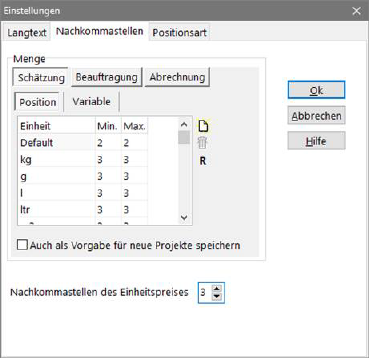 Nachkommastellen lassen sich weiterhin abhängig von der Einheit einstellen. Die Änderungen werden in der Ausschreibung über das Menü Datei/Einstellungen vorgenommen und gelten für das aktuelle Projekt. Per Checkbox lassen sich die Einstellungen für neue Projekte als Vorlage abspeichern. Alle Module, die Mengen berechnen oder anzeigen, benutzen diese Einstellungen.