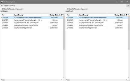 Mit dem Schalter Pos im Kostenfenster können Sie sich die Positionen für eine gewählte Kostengruppe direkt zum Vergleich anzeigen lassen. Hier werden neben dem Kurztext die geschätzte oder abgerechnete Menge, sowie der zugehörige EP angezeigt.