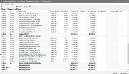 Nach Erfassung eines Bieternamens erscheint dieser in der Auswahlliste. Starten Sie über den Schalter Angebot bearbeiten in der Schalterleiste oder mit Doppelklick auf den Bieter in der Liste ein Fenster zur Angebotsprüfung. Im Fenster erscheint das Leistungsverzeichnis mit den ausgeschriebenen Mengen und zusätzlichen Spalten zur Erfassung der Bietereinheitspreise und Berechnung der Gesamtpreise. Tragen Sie die Einheitspreise für das aktuelle Angebot ein und vergleichen Sie den berechneten Gesamtpreis mit Ihrer Vorlage.