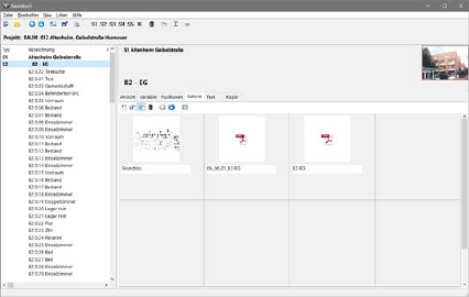 Im Register Galerie können Sie Dokumente unterschiedlichster Art zu einem Raum oder einer Gliederungsstruktur ablegen. Bildformate mit den Endungen *.png, *.bmp, *.jpg, *.gif, *.wmf, *.emf, werden direkt angezeigt, die übrigen Formate wie z.B. *.pdf können mit Doppelklick auf das Symbol mit der verknüpften Software unter Windows gestartet werden. Fügen Sie neue Bilder mittels Windows- Zwischenablage ein (Kopieren und Einfügen mit der rechten Maustaste) oder wählen Sie den Schalter Dokument/Grafik laden, mit dem Sie einen Dateiauswahldialog öffnen.