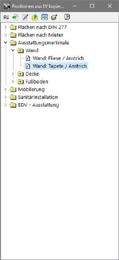 Bei der Übernahme von Positionen wird nach einem Parameter für die Mengenermittlung gefragt. Geben Sie hier die zuvor erfassten Variablen des Raumes ein. Sie können aber auch direkt eine Zahl eingeben um z.B. die Zahl der Heizkörper einzutragen. Handelt es sich um die Position Wandanstrich, könnte hier die Variable WFL für Wandfläche stehen. ASBwin wird später bei der Mengenermittlung für diese Positionen automatisch die Wandflächen aller verknüpften Räume annehmen. Weitere Schalter in dem Fenster Positionen aus LV kopieren dienen dem schnellen Wechsel zwischen einzelnen Räumen oder der Übernahme kompletter Ausstattungen zwischen zwei identischen Räumen. Die Bedeutung der einzelnen Schalter wird angezeigt, wenn Sie den Mauszeiger kurz auf diesen ruhen lassen.