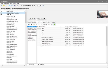 Im Register Positionen können sie einzelnen Räumen Leistungen aus dem Leistungsverzeichnis zuordnen und so u.a. eine raumbezogene Mengenermittlung durchführen. Zur besseren Übersicht wurden hier sogenannte Positionsgruppen oder Kategorien eingeführt, in welchen einzelne Leistungen zusammengefasst werden können.