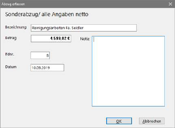 In dieser Maske werden Sonderabzüge erfasst. Die Bedeutung der Felder ist unter Schlussrechnung beschrieben.