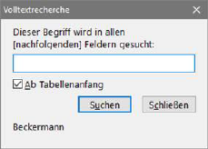 Eine weitere Funktion zur Adressensuche ist die Volltextrecherche. Hierbei können Sie nach beliebigen Begriffen innerhalb des Adressdatensatzes suchen. Starten Sie die Volltextrecherche mit dem Befehl Bearbeiten – Volltextrecherche oder mit Alt-F3. Es erscheint ein Fenster mit Eingabefeld. Geben Sie eine Straße, Telefonnummer, PLZ oder einen beliebigen Begriff aus dem Notizfeld ein. Es werden daraufhin alle Adressen durchsucht. ASBwin beginnt mit der Suche von der jeweils aktuellen Position, wenn nicht die Checkbox ab Tabellenanfang markiert ist. Bei der Suche werden Wildcards, bzw. Platzhalter (*,?) unterstützt. Das Zeichen „*“ ersetzt hierbei Wortteile, während das Zeichen „?“ einzelne Buchstaben im Suchbegriff ersetzt.