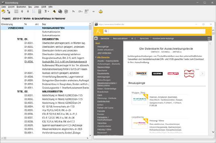 Für die Auswahl von Textbausteinen werden eine Explorer- Darstellung mit Herstellersortierung sowie ein Eingabefeld für Suchbegriffe angeboten. Für die Übernahme klicken Sie einfach die gewünschte Position im Suchfenster an und ziehen diese mit der Maus an die entsprechende Stelle des Leistungsverzeichnisses.