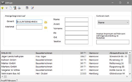 Eine weitaus mächtigere Suchfunktion stellt die sogenannte Abfrage dar. Betätigen Sie hierzu den Abfrageschalter in der oberen Schalterleiste. Es erscheint die Abfragemaske am Schirm. Hier können Sie nun verschiedene Suchkriterien eingeben und diese miteinander verbinden. Geben Sie z. B. als gesuchtes Gewerk Bauunternehmen ein. Sie können hierzu den Auswahlschalter hinter dem Eingabefeld benutzen. Geben Sie zusätzlich den Ort Hannover ein. Bei Starten der Abfrage mit dem Aktivierungsschalter (Glühlampe oben links) werden alle in Frage kommenden Adressen angezeigt.