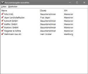 Sie können jetzt einzelne Adressen herausnehmen, indem Sie die Markierung durch Anklicken mit der Maus löschen. Anschließend wählen Sie den Menüpunkt Listen, um die gewünschte Listenart zu aktivieren.