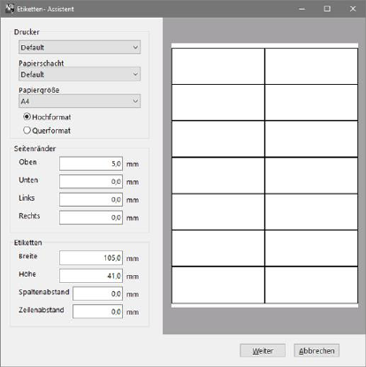 Diese Liste erzeugt Etikettenlisten. Sie können unterschiedliche Etikettenformate bearbeiten. Hierzu wird ein Report- bzw. Listendesigner angeboten. Richten Sie sich die gewünschten Etikettenlisten mit den Adressdatenfeldern ein und wählen Sie später eine der Listen für den Ausdruck aus.
