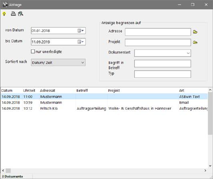 In dem Abfragefenster geben Sie zuerst den Zeitraum an, über den die Abfrage durchgeführt werden soll. Legen Sie anschließend fest, ob nur unerledigte oder alle Dokumente abgefragt werden sollen. Nach Festlegung der Sortierung lassen sich weitere Eingrenzungen definieren. Möchten Sie nur Dokumente zu einer bestimmten Adresse oder einem Projekt angezeigt bekommen, fügen Sie die entsprechenden Selektionskriterien mit Hilfe der gelben Auswahlbuttons hinzu.