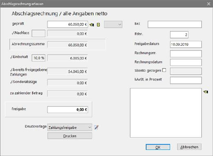 Fenster zur Erfassung von Abschlagsrechnungen