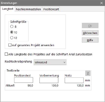 Unter dem Menüpunkt Datei - Einstellungen - Einstellungen Projekt können Sie Einstellungen für die Schriftgröße im Langtext vornehmen. ASBwin verwendet normalerweise Arial 10 Punkt.