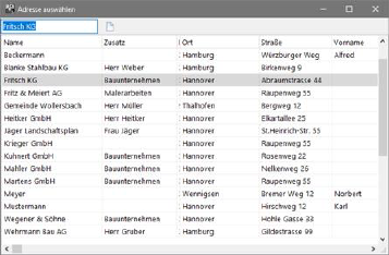 Im nächsten Feld wird das aktuelle Datum erfasst. Um einen Auftragnehmer zuzuweisen, öffnen Sie mit dem Schalter hinter dem Firmenfeld die Adressenliste. Mit dem Rollbalken oder einem Eintrag in das Suchfeld können Sie in der Liste navigieren. Durch Doppelklick auf eine Adresse wird diese als Auftragnehmer übernommen.