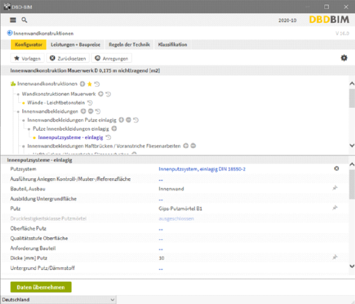 Die Schnittstelle zu DBD-BIM ist eine Weiterentwicklung von DBD-KostenElemente. Beim DBD-BIM werden komplette Elemente in einzelne Positionen aufgesplittet. Die Positionen können individuell konfiguriert werden und werden mit der benötigten Menge übergeben. Die Elemente können in ASBwin unter anderem als Gliederungsstufe importiert werden.