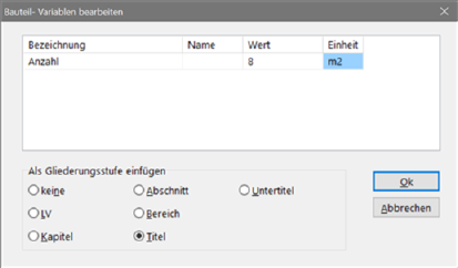 Bei der Übergabe der Daten können Sie die Anzahl und die Art der Gliederungsstufe festlegen. Da ein Element aus vielen einzelnen Positionen besteht, sollte dies in ASBwin als Gliederungsstufe zusammengesetzt werden.