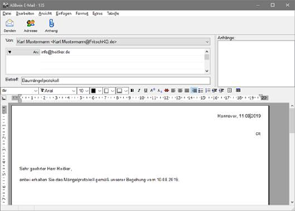 Über das Menü Bearbeiten/ Adresse zuordnen lassen sich Adressen aus der Adressverwaltung auswählen. Im Feld Betreff können auch Variablen Verwendung finden. Das Feld Anhänge steht für die Zuweisung von Dateianhängen zur Verfügung. Im Haupttext können anlog zu den anderen Dokumenteneditoren Variablen eingetragen werden. Der E-Mail Text wird immer im HTML- Format gespeichert bzw. versandt. Über das Menü Datei/ Senden wird die E-Mail versandt.