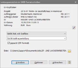 Fenster zum Exportieren von GAEB-DA86 (Auftragserteilung)