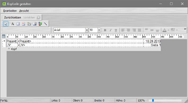 Um eine Kopfzeile zu bearbeiten, klicken Sie den entsprechenden Schalter in der Schalterleiste. Es wird ein Fenster zur Gestaltung von Listenköpfen geöffnet. Sie können die einzelnen Textelemente mit der Maus anklicken und an den gewünschten Ort ziehen. Logos oder sonstige Bildelemente lassen sich ebenfalls einbinden. Über einen Schalter in der Menüleiste können Sie auf alle unter ASBwin verfügbaren Variablen zugreifen um diese in die Listenköpfe einzubinden.