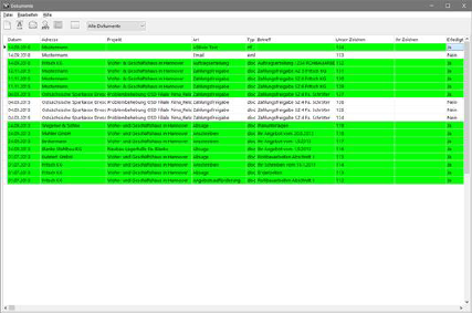 Die Dokumentenverwaltung unterscheidet sich in der Fensterdarstellung von den anderen Modulen, da hier keine Register Verwendung finden. In einer Tabelle werden Datum, Adresse, Projekt, Vorlagentyp und eine Bemerkungszeile angezeigt. Die Dokumente lassen sich nach verschiedenen Kriterien sortieren und filtern. Möchten Sie ein bestehendes Dokument öffnen, genügt ein Doppelklick auf die entsprechende Zeile. Anschließend wird das zum Dokument gehörige Programm wie z.B. WinWord mit diesem Dokument gestartet. Nach Abschluss der Bearbeitung finden Sie sich in der Dokumentenverwaltung von ASBwin wieder.